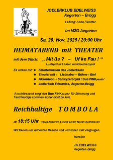 Musikalische Umrahmung des Heimatabends mit Theater (Liebhaber-Bühne Biel) vom Jodlerklub Edelweiss Aegerten-Brügg unter